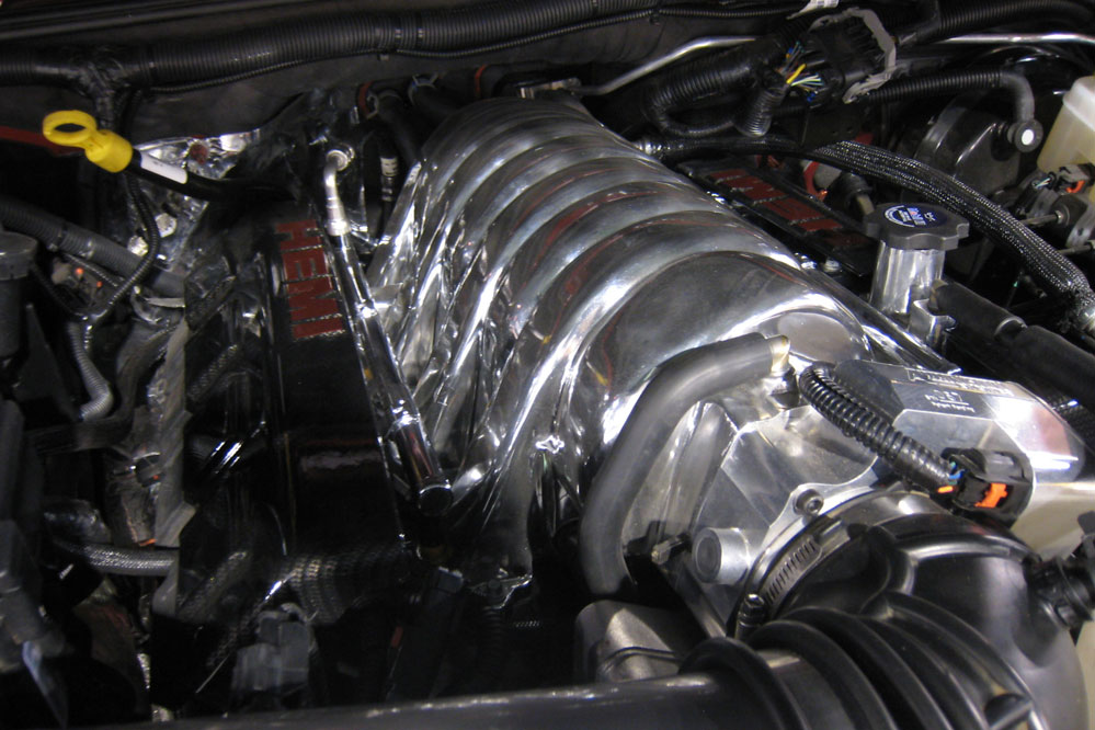 He whipped out a photo album showing Orange Crush with its entire front end ripped off during the surgery. He then opened the hood, now stuffed full of V8. Crocker claims 665 horsepower. Orange Crush uses Chrysler's 545RFE five-speed automatic. You can scan the build sheet here.